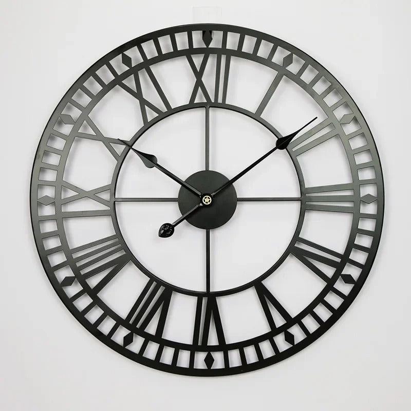 Son large cadran ajouré, fabriqué en métal noir de haute qualité, offre une lisibilité claire et élégante. Les grandes aiguilles dorées contrastent subtilement avec le fond, créant un effet visuel à la fois sobre et impactant. Légère mais robuste, cette horloge en chiffre romain est conçue pour apporter une touche de modernité discrète tout en évoquant un charme d’époque.